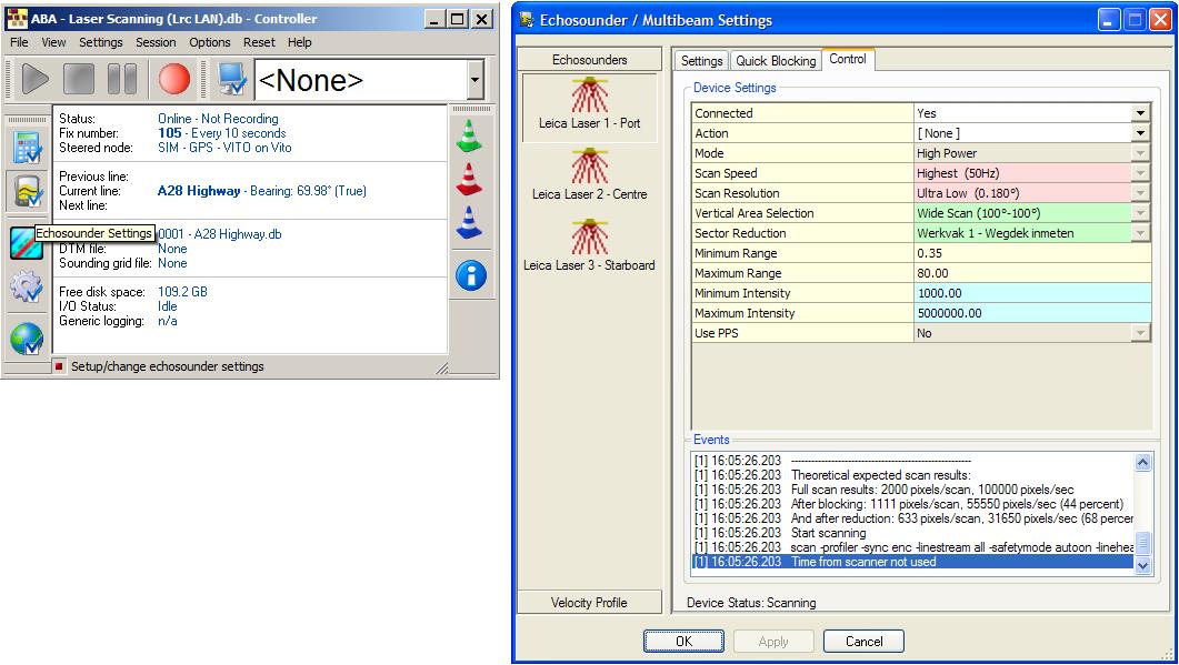 Select Echosounder Settings, click on the Laser System icon, and select the 'Control' tab page.