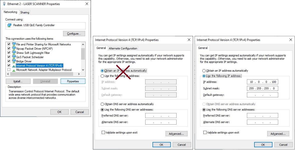 If you can ping the scanner without using parameter '-4' but you don't get a reply when using it ("Request timeout") then please change the Internet Protocol Version 4 (TCP/IPv4) setting of your network card from automatic to match the range of the laser scanner itself: