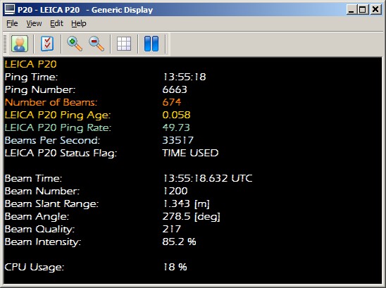 The Generic Display can be used to validate the laser data integrity. It shows the numerical values for the number of beams (pixels) being scanned per ping (scan), the number of beams being scanned per second, the ping rate (scan rate in Hz), range values, etc.