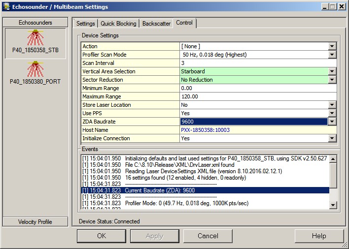 Select Echosounder Settings, click on the Laser System icon, and select the 'Control' tab page.