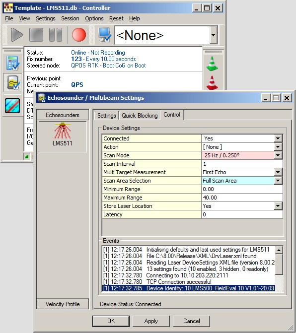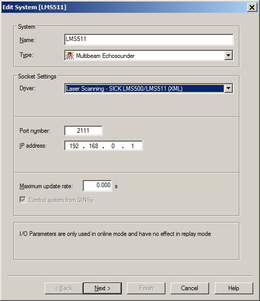 Add a Multibeam Echosounder system to your template setup, and select driver "Laser Scanning - SICK LMS500/LMS511 (XML)".