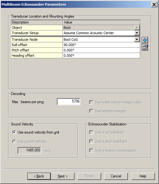 As a rule of thumb, when you mount the laser unit backwards on your moving vehicle (connectors and cables pointing to bow), and the face (scan area) of the unit is pointing downwards, then you may leave the Roll, the Pitch and the Heading offset zero. A scanned profile as seen in a Raw Multibeam display should then be as in the real world.