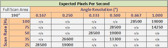 Not all combinations between an angle resolution and scans per second are allowed. This driver only allows you to select valid combinations.The maximum expected number of beams (pixels) per second is 28500 (theoretically).