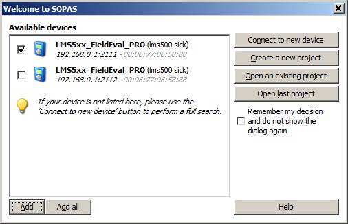 During start-up the program will scan automatically for any connected SICK device. If no results are displayed, check the network and/or power cable of the scanner. You may have to turn off your WiFi network in order to let the program find a device.