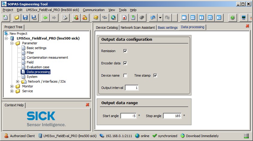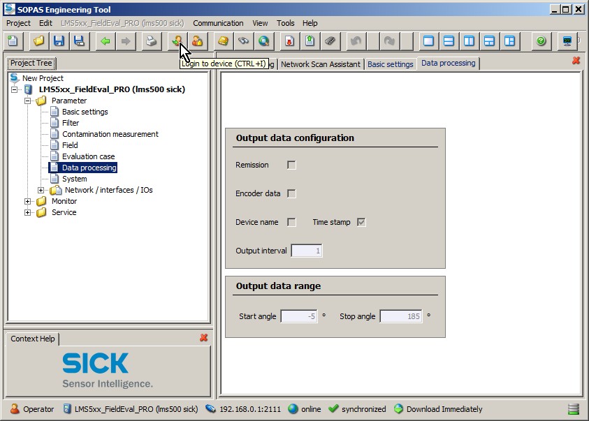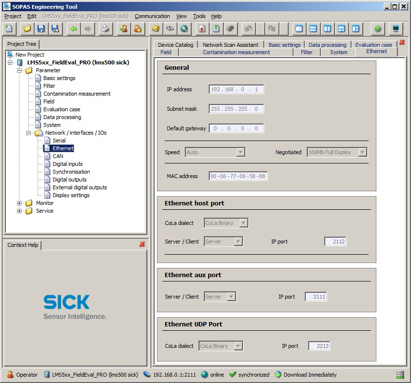 The exact LAN IP address of the laser unit should be provided by the manufacturer or your reseller. Normally SICK configure their laser units with IP address 192.168.0.1. The default TCP port number is 2111. See paragraph SOPAS settings below for more information about how to establish the exact IP address and port number.