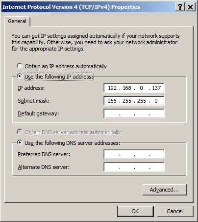 Control Panel, Network and Sharing Center, Change adapter settings, Click right-mouse on Local Area Connection, Properties, Internet Protocol Version 4 (TCP/IPv4), Properties...