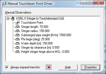Click Properties in Manual Layback Driver user interface to edit the parameters: Stinger length / Stinger radius / Submerged pipe weight / Phi begin / Water depth / Stinger tip clearance / Height stinger above MSL.
