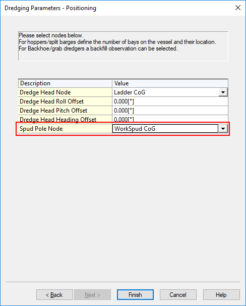 The work spud information is computed using the position of the spud node as selected in the 'Dredging Parameters - Positioning' dialog in the Database Setup Program.