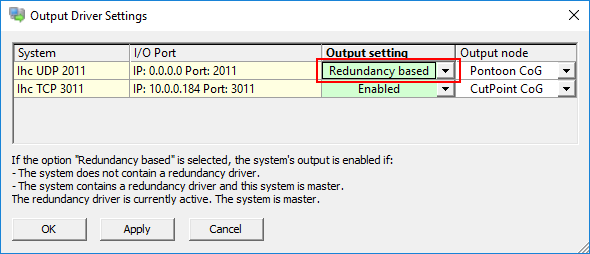In case multiple Qinsy systems are combined in a redundant setup set the 'Data output' field to 'Redundancy based' in order to enable the redundancy feature.