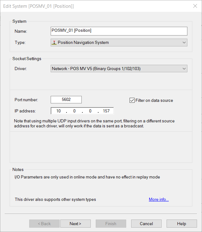 Parameter 'POSMV' tells the driver to expect data from a POS MV™ unit.
