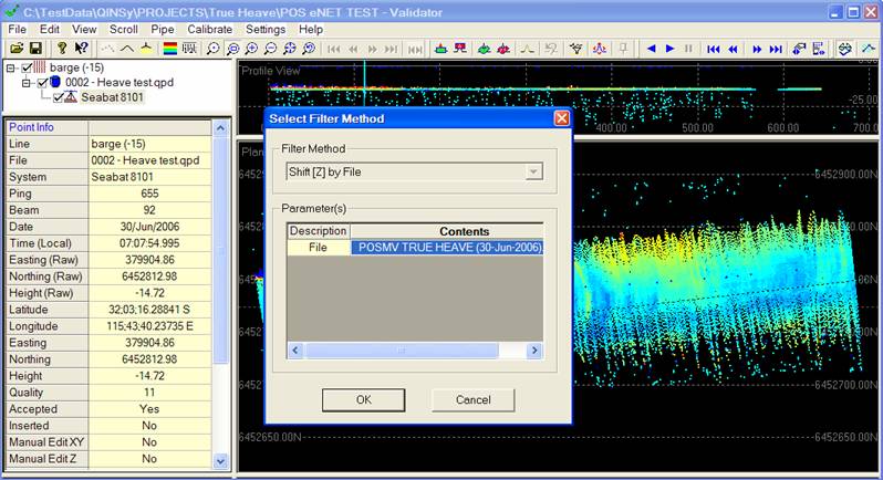 CODEDD-MM-YY, UTC, (REAL-TRUE), TRUE HEAVE, RMS, REAL HEAVE, RMS 02-08-06,14:31:56.196,0.0025,-0.0009,0.0010,-0.0035,0.0215 02-08-06,14:31:56.546,0.0025,-0.0010,0.0010,-0.0035,0.0215 02-08-06,14:31:56.797,0.0026,-0.0010,0.0010,-0.0035,0.0215 02-08-06,14:31:57.137,0.0026,-0.0010,0.0010,-0.0035,0.0215This text file may be used in the Validator, when selecting the "Shift [Z] by File"-Filter, because the third column contains the difference between the Real and True Heave. See paragraph Processing below for more about this.