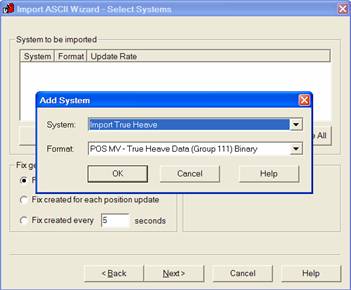 On the second wizard page you must add the system to be imported: Select from the available system the 'empty' motion sensor system, and the POS MV - True Heave Data format. (Notice that if you select a Motion sensor system that already contains data, all data will be overwritten, which means that roll and pitch values will be zero-ed!).