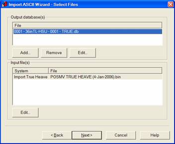 On the third wizard page you must first select the database that will be uploaded with the True heave data. It is recommended to select a new name, leaving the original recorded database intact. Secondly, you must browse for the True Heave log file. It should be located in the project's Import folder.