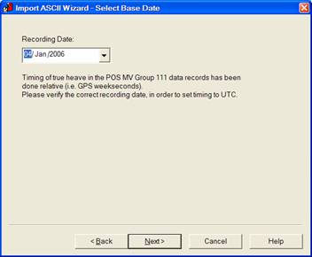 The fourth wizard page will show, in case you selected the binary True heave format (*.bin), the recording date. Just check that this date is correct: it will be used to convert the relative GPS weekseconds from the Group 111 messages to absolute UTC time stamps of the imported True heave data.