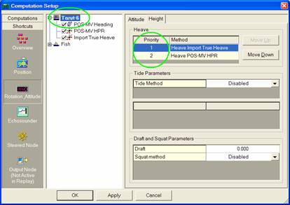 Secondly, click on the vessel object and select the Height tab page. Make sure that the Heave Priority Number 1 is the new motion system, containing the imported true heave data.