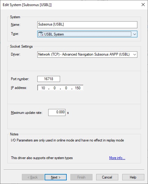 Add a USBL System to your template setup and select driver "Network (TCP) - Advanced Navigation Subsonus ANPP (USBL)".