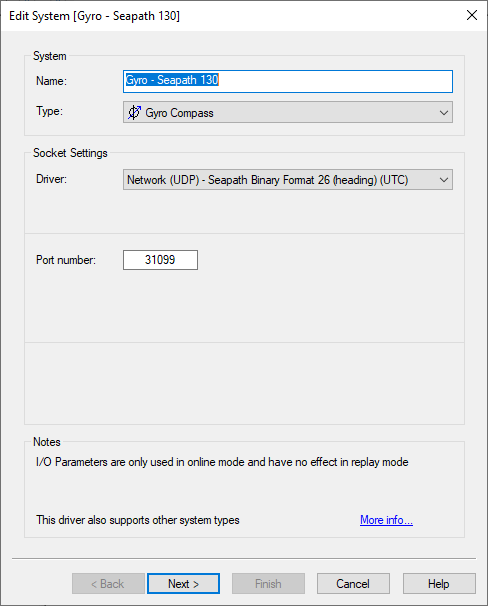 To decode the pitch, roll and heave, add a system of type "Pitch, Roll and Heave sensor" to the Qinsy database and make sure to select the same driver name and the same I/O parameters as for the Gyro system.