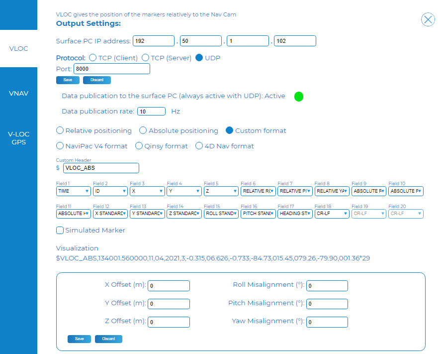 $VLOC,hhmmss.ss,mm,dd,yyyy,i,x.xxx,y.yyy,z.zzz,R.RR,P.PP,Y.YY,I.III,J.JJJ,K.KKK,L.LL,M.MM,N.NN<CR><LF> $VLOC_ABS,hhmmss.ss,mm,dd,yyyy,i,x.xxx,y.yyy,z.zzz,R.RR,P.PP,Y.YY,r.rr,p.pp,h.hh,I.III,J.JJJ,K.KKK,L.LL,M.MM,N.NN<CR><LF>