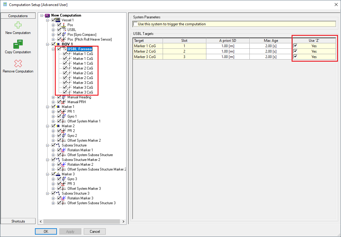 Make sure to enable all USBL observation in the Computation Setup with the 'Use Z' option ticked.