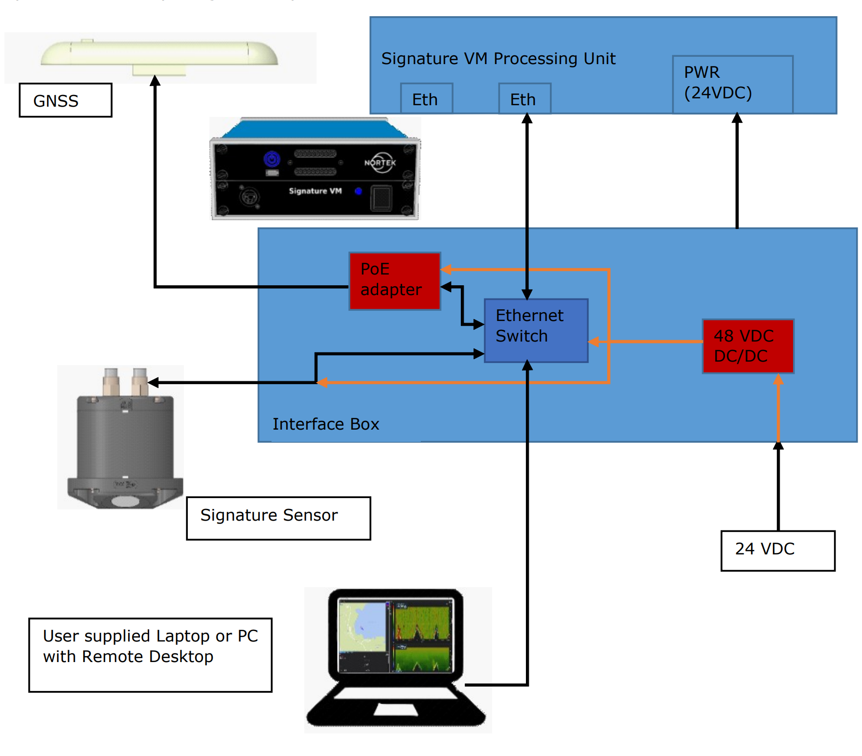 The system consists of a GNSS, a Signature series ADCP sensor (e.g. VM Operations (333 kHz), Signature1000 or Signature55) and dedicated computer with the Signature VM software.