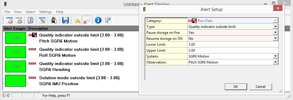 For a Position Navigation System you can monitor the INS Status as Solution mode in a Position System Display, as RAW DATA Positioning item Solution Mode in a Generic Display, or as Raw Alert 'Solution Mode outside limit' in the Alert Display.