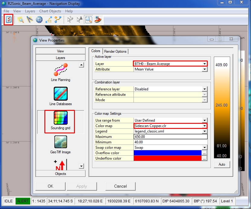 When using a layer of the type Sidescan, one will be able to use a different color table for the Intensity data: