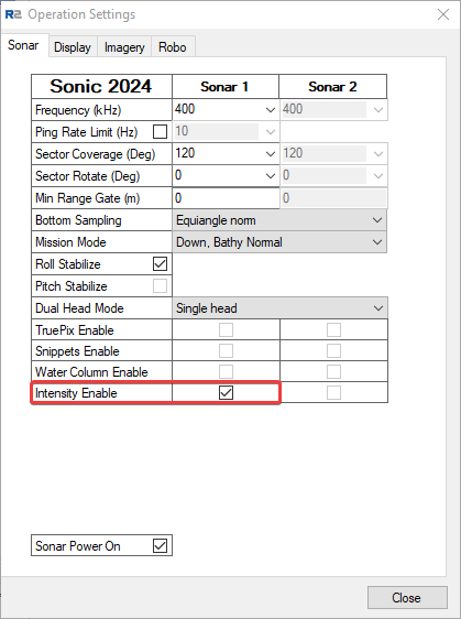 If the sending of Intensities is enabled in the R2Sonic 2000 control software (see picture below) then the driver will decode the Intensity Beam Average value as the backscatter value per beam which can be stored in a Sounding Grid layer (see Qinsy Online section).