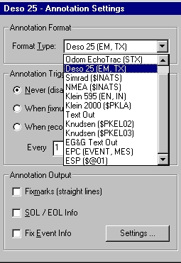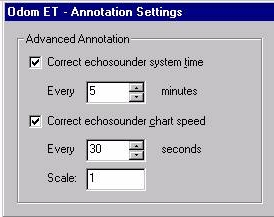 For the Odom Echotrac, advanced annotation options are to correct the echosounder system time, or to set the echosounder chart speed, using the vessel speed over ground.