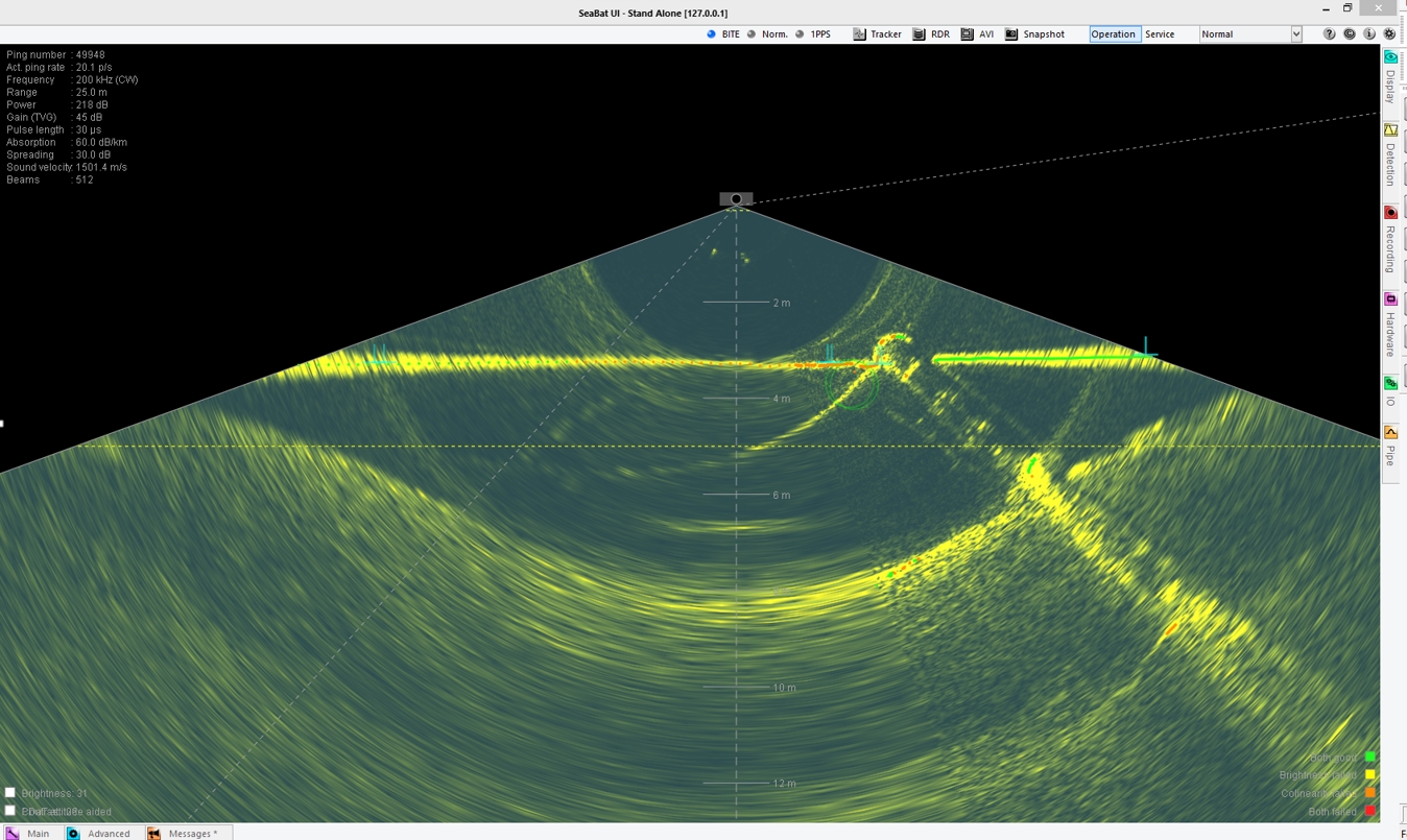 Due to internal buffering inside the Seabat Software the detected pipe record will lag 25-50 pings behind on the bathymetry data. This can be a problem at low ping rates, read warning below.