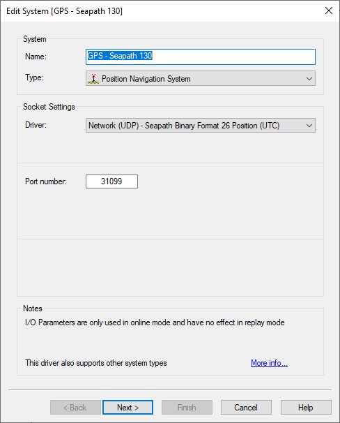 Add a miscellaneous system to your setup and select driver “Seapath Binary Format 26 (Delayed Heave)”, “Network (UDP) - Seapath Binary Format 26 (Delayed Heave)” or “Network (TCP) - Seapath Binary Format 26 (Delayed Heave)”.