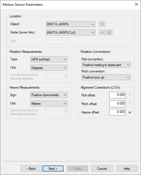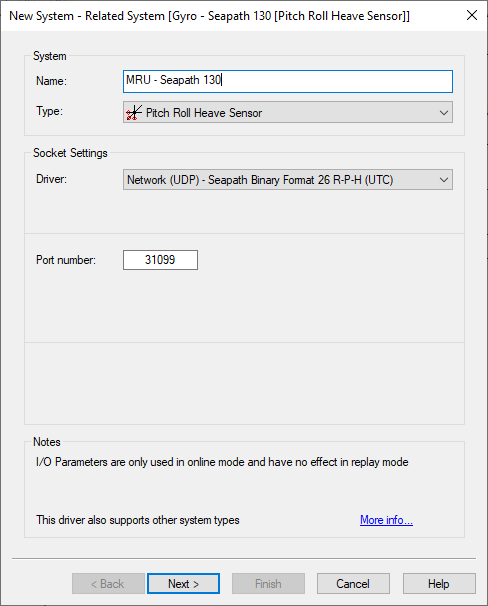 To decode the pitch, roll and heave, add a system of type "Pitch, Roll and Heave sensor" to the Qinsy database and make sure to select the same driver name and the same I/O parameters as for the Gyro system.