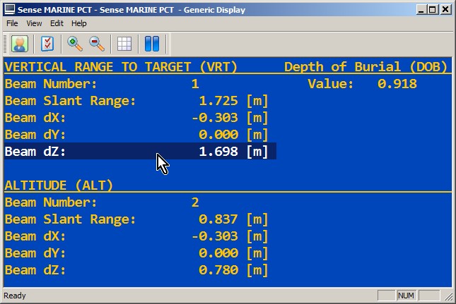 Beam 1 represents the top of the detected target (pipe or cable) and beam 2 represents the seabed surface. So in the above example you will notice that the target is buried for almost one meter (0.918m to be exact).