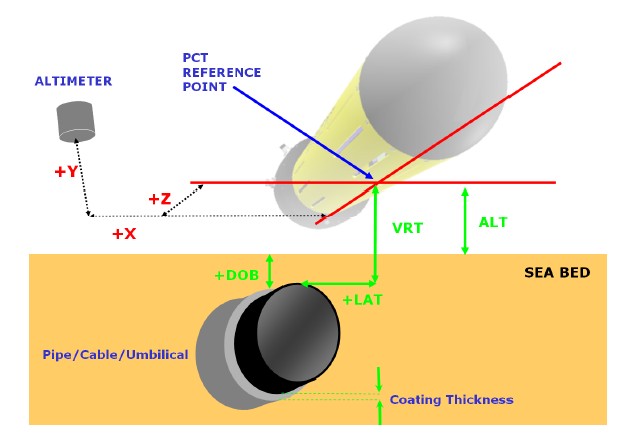 The target depth of burial (DOB) is defined as: VRT minus ALT. The value is positive when the target (pipe/cable) is covered and negative when exposed.