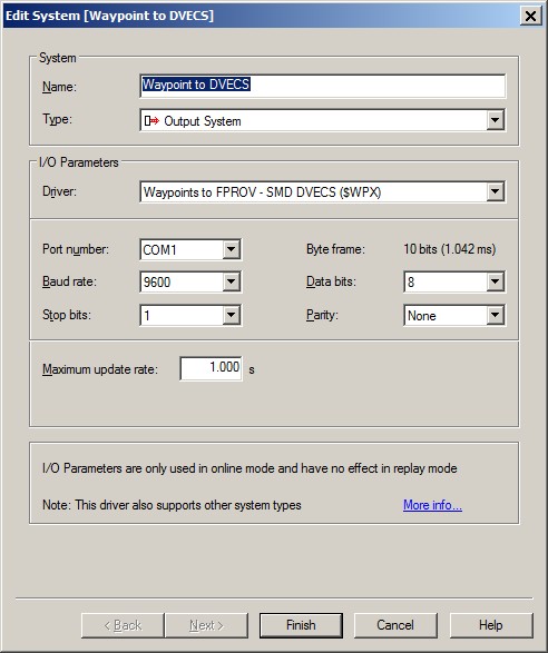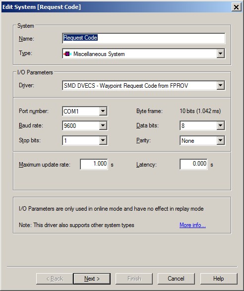 In order to do so, add a new Auxiliary System to the database template, type "Miscellaneous System", and select driver "SMD DVECS - Waypoint Request Code from FPROV".