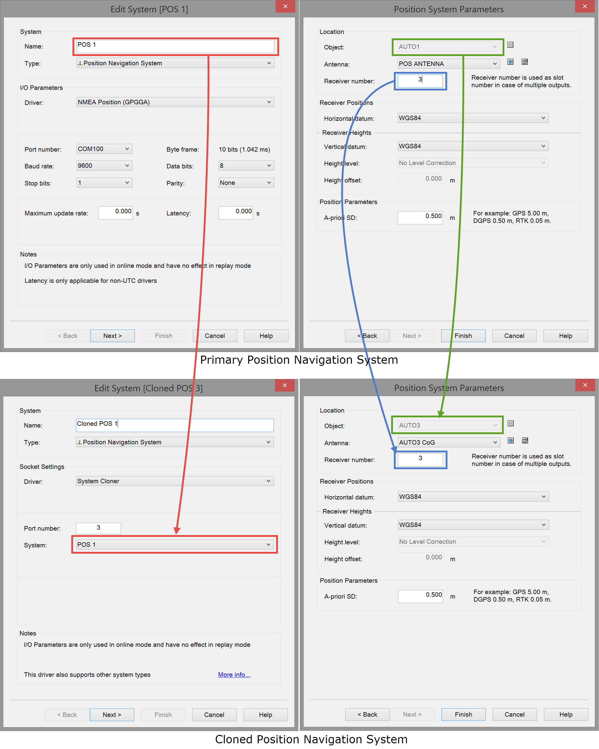 Where one object moves in a vertical direction, but not horizontal, with respect to a second object, as in the case of a fall pipe vessel. Both objects have the same heading so use the System Cloner to copy the gyro on Object 1 to Object 2.