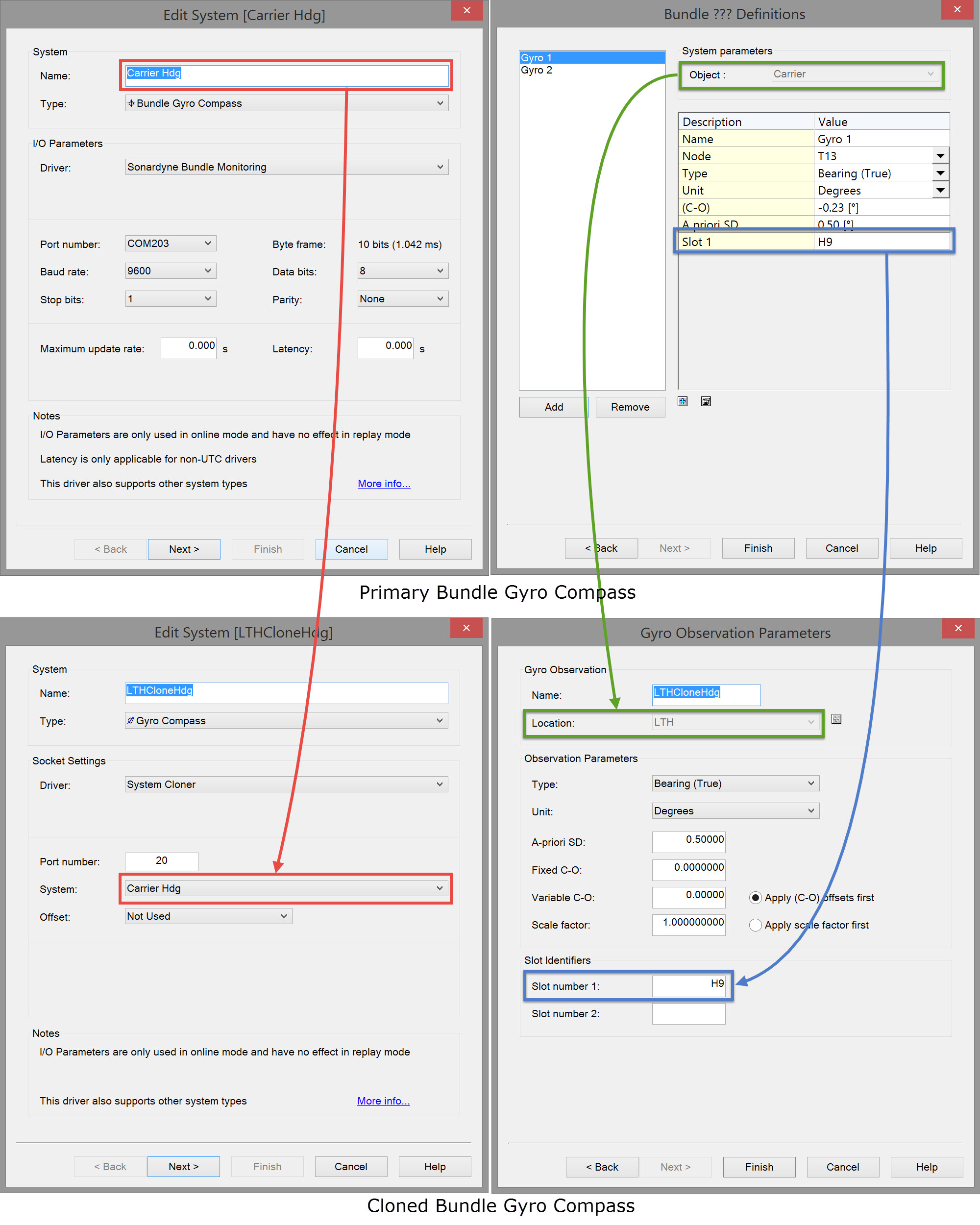 The cloned gyro clones 'Carrier Hdg' and is defined on object 'LTH' with a slot number also 'H9'.