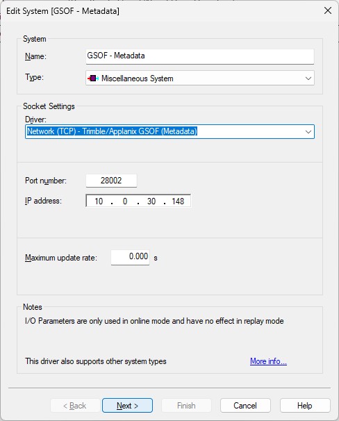 "Network (UDP/TCP) - Trimble/Applanix GSOF (Metadata)" when using the network interface.