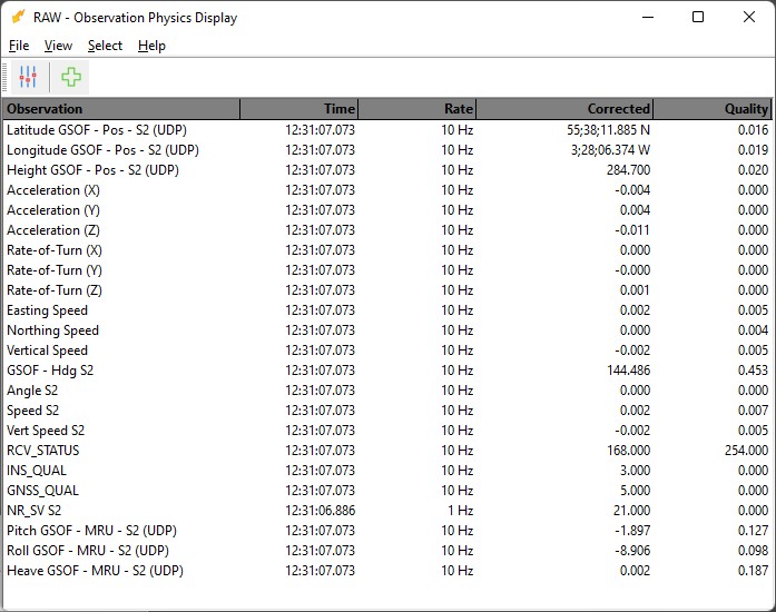 A generic display is particular useful to show the meaning of the several status indicators from the meta data observations (GNSS Quality, INS Quality, Receiver Status, Nr of SV's)