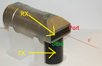 For normal bathymetric surveys the Receive transducer faces downwards and the projector (TX) is mounted to the aft. The approximate mounting angles in Qinsy will be RX 0, TX 0, Heading 0.