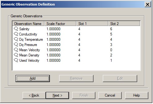 Environmental data such as mean velocity and mean density can be decoded (and displayed) as a "generic observation". Add an auxiliary system of type "Miscellaneous system" to the database, select the "Tritech SCU-3 Bathy Environmental Data" driver of the same type (Passive or UTC) and the same I/O parameters as the bathymetry system (if it was defined). In case these two systems are defined for one SCU-3 unit (slot), Qinsy will start up only one driver module. The "Generic Observations" that can be added are given in the following table. Slot number 1 must again correspond to the slot number of the bathymetric source device.