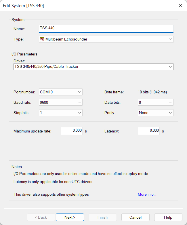 If lateral or vertical offset field(s) contains '???' then the multibeam data will not be decoded if the driver selected is “TSS 340/440/350 Pipe/Cable Tracker”. To decode the multibeam data anyways, please select the “TSS 340/440/350 Pipe/Cable Tracker (Ignore Offset Quality)“ driver instead. In that case, the X and Z value of beam 1 will be set to 0.