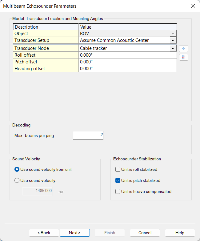 Normally this will be the middle of the center TSS coil frame mounted on the ROV.Set the Max. beams per ping: 2