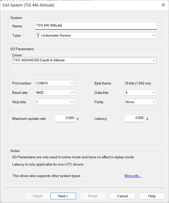 Select driver: “TSS 340/440/350 Depth & Altitude” optionally with (Ignore Quality) option