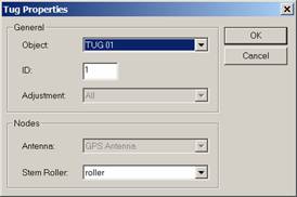 User can add a tug and set its nodes for the stern roller and the GPS antenna through the Tug Properties dialog.