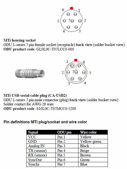 Further, an extract from the "MTi and MTx User Manual and Technical Documentation" manual shows the following necessary wiring of the lemo-plug:
