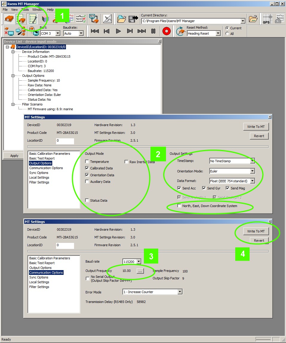 As soon as the driver is started (on-line) it will send certain commands to the MTi sensor. The first command will be a request for the current Configuration parameters. The output mode and output settings are part of these parameters. If the output mode and output settings are not conform requirements, the driver will send several commands to the MTi sensor to correct this.