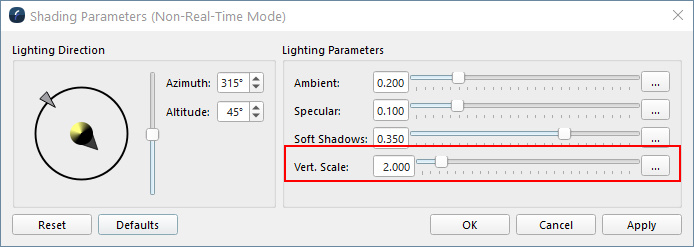 The largest changes are in the default value for the Vertical Scale shading parameter, and how it is used across surfaces. Note that if you have an existing version of Fledermaus installed, you will still see the old default values. To use the new values, you can reset your preferences by going to "File > Preferences...", and pressing the "Reset" button.
