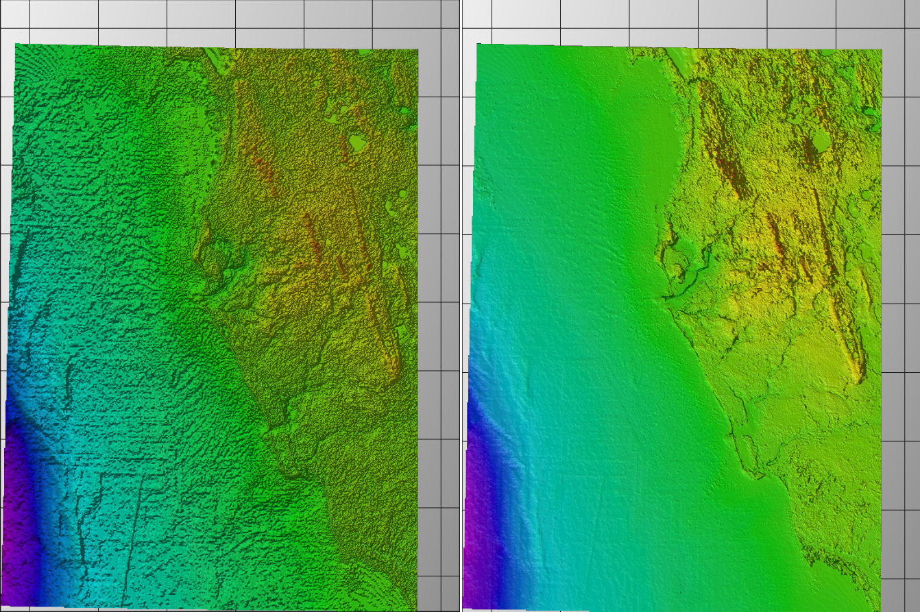 The improvements for large Z-range data sets are visible in the image below, with FM8.1 on the left, and FM8.2 on the right. Note the FM8.2 shading is using a vertical scale of 100x to achieve a similar result to the defaults in Fledermaus 7.