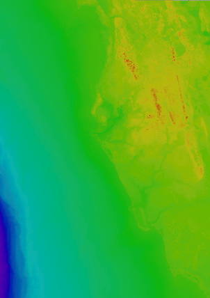 Please note that because of these changes, data sets with large Z ranges (such as a regional overview from the GEBCO data set) will look like they have little or no shadows when using the default parameters. In this situation, the shadows are correct, but are not visible at the large scale, as shown below. In these situations, you can increase the vertical scale to achieve shading results similar to the default output from Fledermaus 7, with a similar data set.