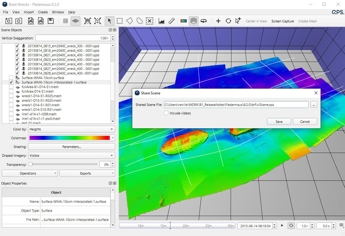 When working with Fledermaus, it is very common to share the created Scenes with other Fledermaus users or those using the Free Viewer. However, with the switch to lightweight scenes in Fledermaus 8.0. the process of sharing a Scene became more complicated. To help with sharing Fledermaus Scenes, we have added a new "Share Scene" tool that will collect all the files into a single compressed Scene file (.qsz extension). The compressed Scene can be given to other Fledermaus users where it will be uncompressed on first use.